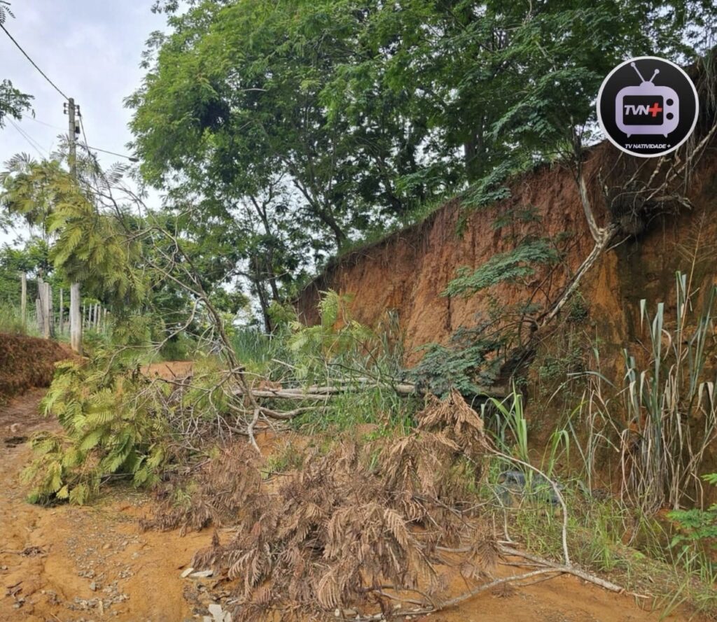 Uma árvore deslizou de um barranco e está bloqueando quase totalmente a passagem de veículos na rua paralela à Rua Vereador Alceu Lannes Tinoco, atrás da Casa dos Parafusos 3 Irmãs, sentido Morada do Engenho, em Natividade-RJ.
