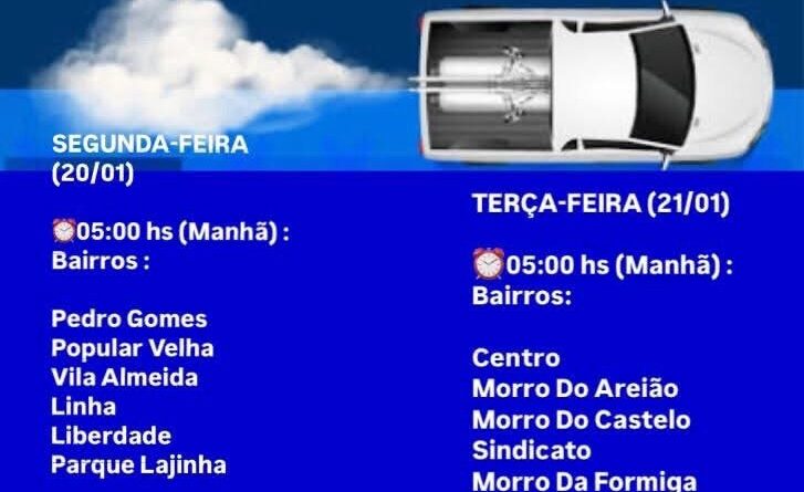 Read More🔈 CRONOGRAMA CARRO FUMACÊ SEGUNDA-FEIRA (20/01) ⏰ 05:00 (Manhã) – Bairros: ⏰ 16:00 (Tarde) – Localidades: TERÇA-FEIRA (21/01) ⏰ 05:00