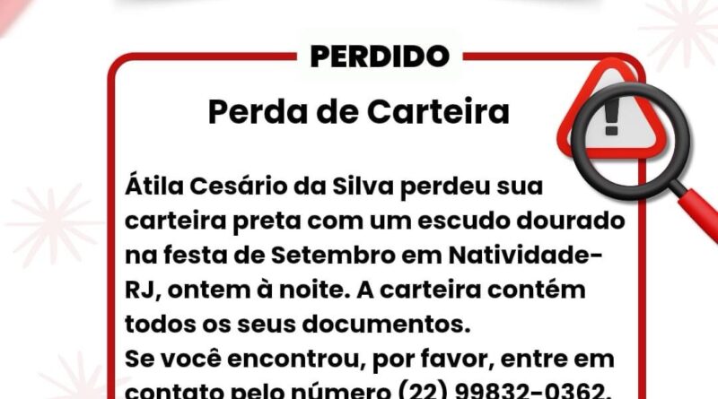 Read More🚨Perda de Carteira🚨 Átila Cesário da Silva perdeu sua carteira preta com um escudo dourado na festa de Setembro em