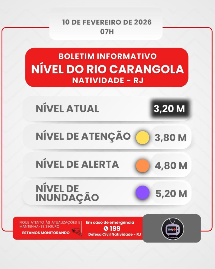 FOTOSNATIVIDADENOTÍCIAS Boletim Atualizado: 10/02/2026 – 07H – Situação do Rio Carangola em Natividade TV Natividade 10 de fevereiro de 202610 de fevereiro de 2026 Choveu 23mm nas últimas 24h!
