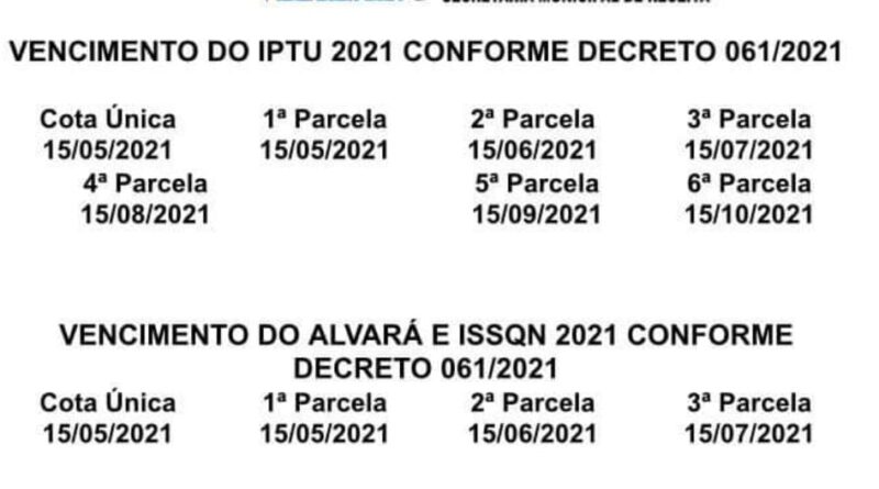 Read MoreO município de Natividade, prorrogou as datas de vencimento para pagamento do IPTU 2021. De acordo com o Decreto N°061/