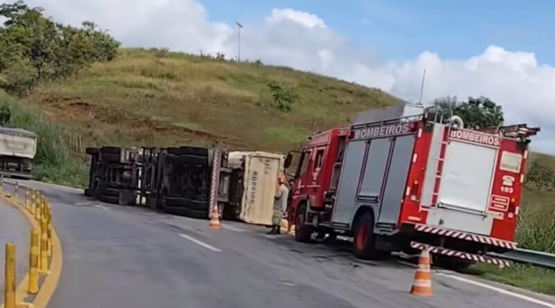 Carreta carregada de soja tomba na BR-356 entre Itaperuna e Italva