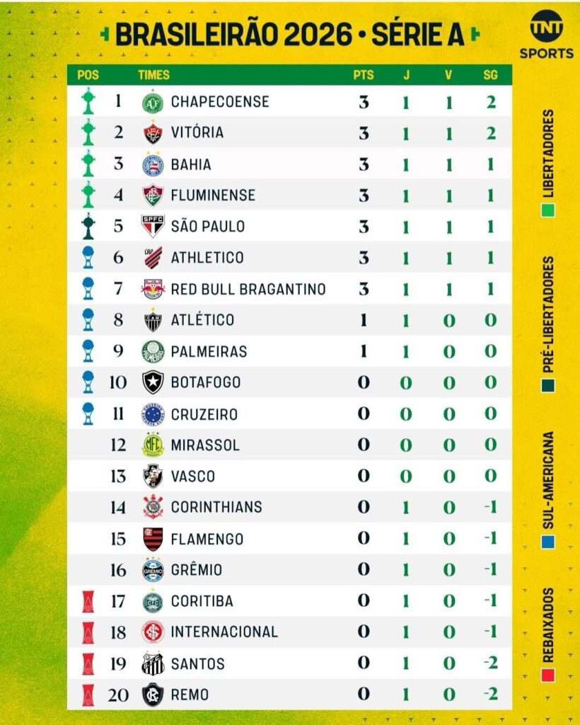 BRASILESPORTEFOTOS Confira a tabela de classificação do Brasileirão 2026 TV Natividade 29 de janeiro de 2026