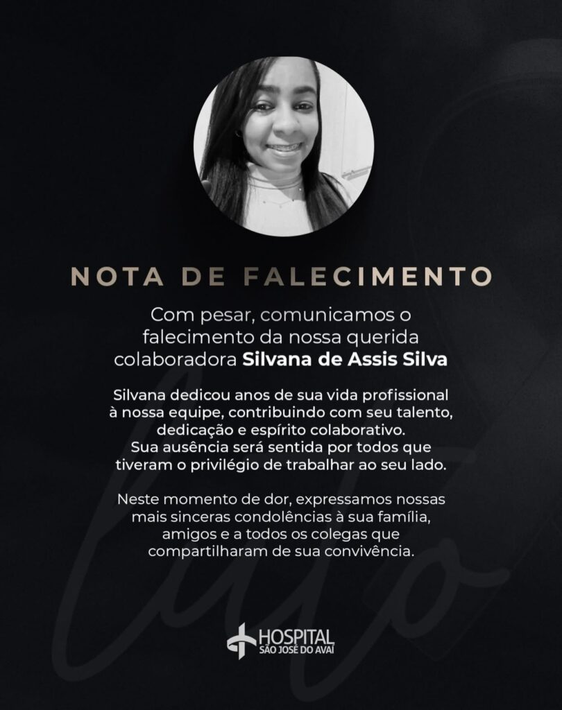 O Hospital São José do Avaí confirmou o falecimento da colaboradora e manifestou profundo pesar por meio de uma nota divulgada em suas redes sociais no sábado, dia 24. Na mensagem, a instituição ressaltou a importância de Silvana e o legado deixado durante sua trajetória profissional. “Silvana, que a lembrança da sua vida permaneça envolta em ternura e imensa admiração por cada instante que compartilhamos. Descanse em paz”, diz o comunicado.