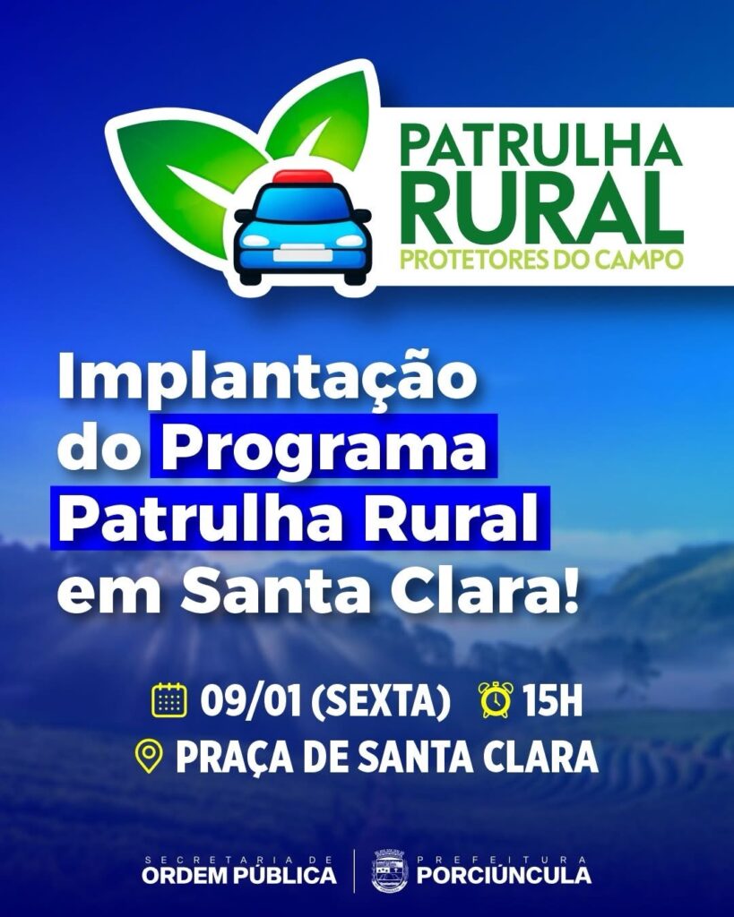 A Prefeitura de Porciúncula anunciou a implantação do programa Patrulhamento Rural no distrito de Santa Clara. A iniciativa é conduzida pela Secretaria Municipal de Ordem Pública e resulta de articulação institucional entre o Executivo municipal e a Polícia Militar do Estado do Rio de Janeiro, por meio do 29º Batalhão de Polícia Militar (BPM).