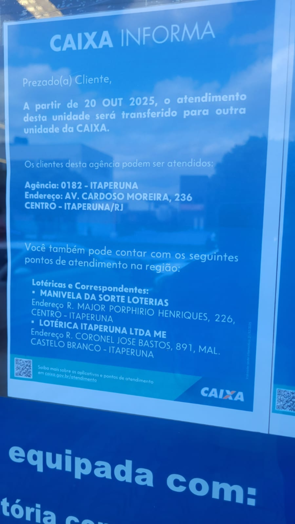 Serão encerradas as atividades da agência Pedra Preta da Caixa Econômica situada na Avenida Presidente Dutra, bairro Cidade Nova, em Itaperuna. Os serviços terminam no dia 20/10/2025 e os atendimentos serão direcionados para a agência na Avenida Cardoso Moreira, Centro, próximo ao Itaú.