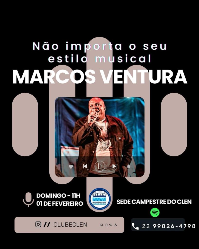 Anota aí: Domingo, 01 de fevereiro, a partir das 11h, tem Marcos Ventura ao vivo na sede campestre do CLEN!