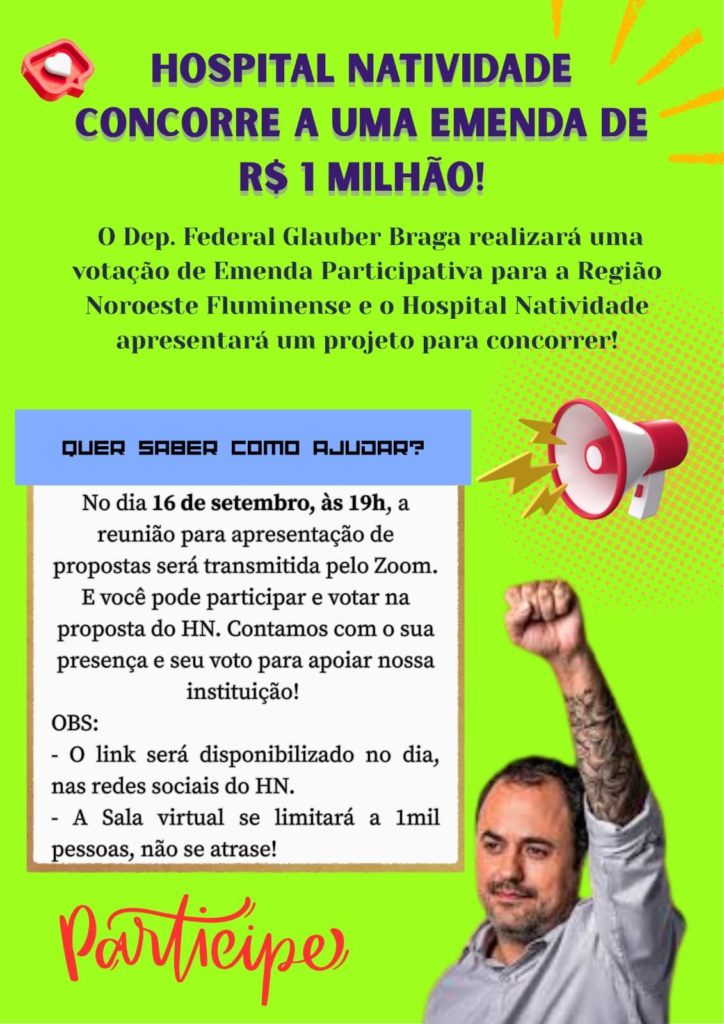 O Hospital Natividade está concorrendo a uma emenda de R$ 1 milhão 💰 na votação participativa do Dep. Federal Glauber Braga!