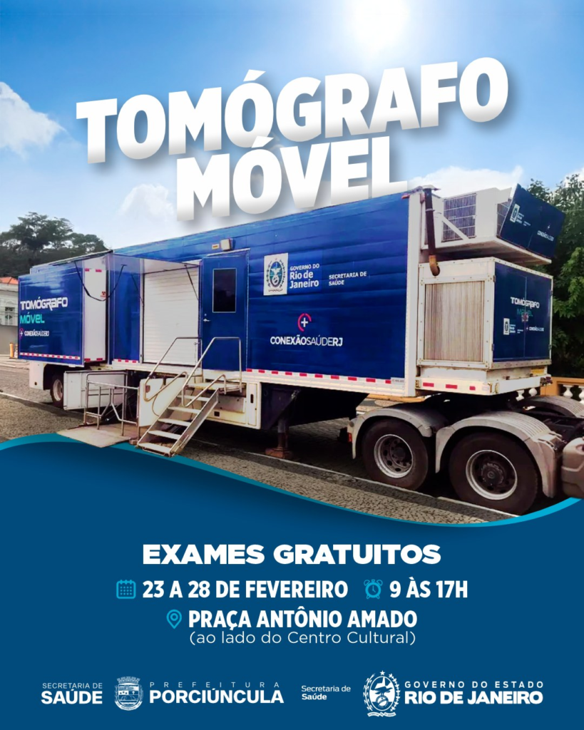 A Prefeitura de Porciúncula, por meio da Secretaria Municipal de Saúde, recebe entre os dias 23 e 28 de fevereiro o Tomógrafo Móvel, unidade itinerante que realizará exames gratuitos de tomografia no município. O atendimento acontecerá de segunda a sábado, das 9h às 17h, na Praça Antônio Amado, ao lado do Centro Cultural.