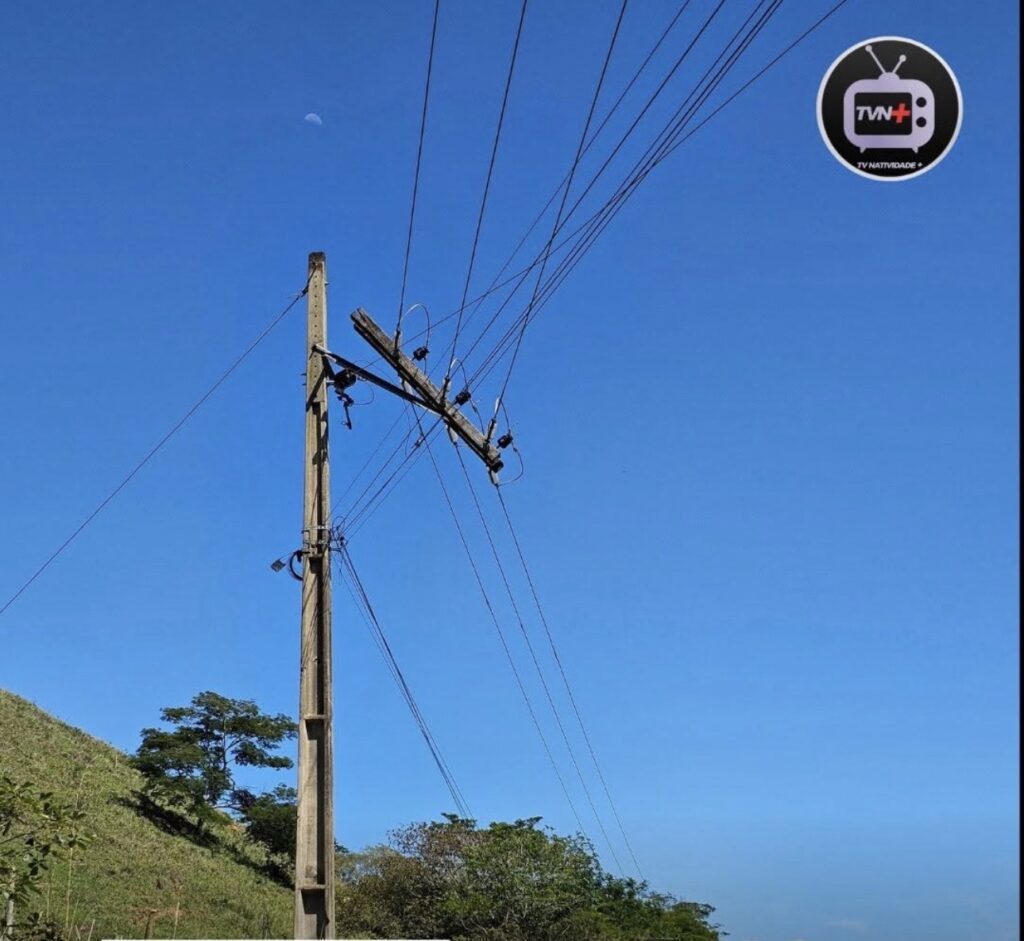 Um poste de energia da ENEL está danificado na altura do Km 02, próximo ao CENOM, na Rodovia RJ-214, em Natividade-RJ. A cruzeta que sustenta os fios de alta tensão caiu, deixando os cabos pendurados e oferecendo sério risco a motoristas, ciclistas e pedestres que passam pelo local.