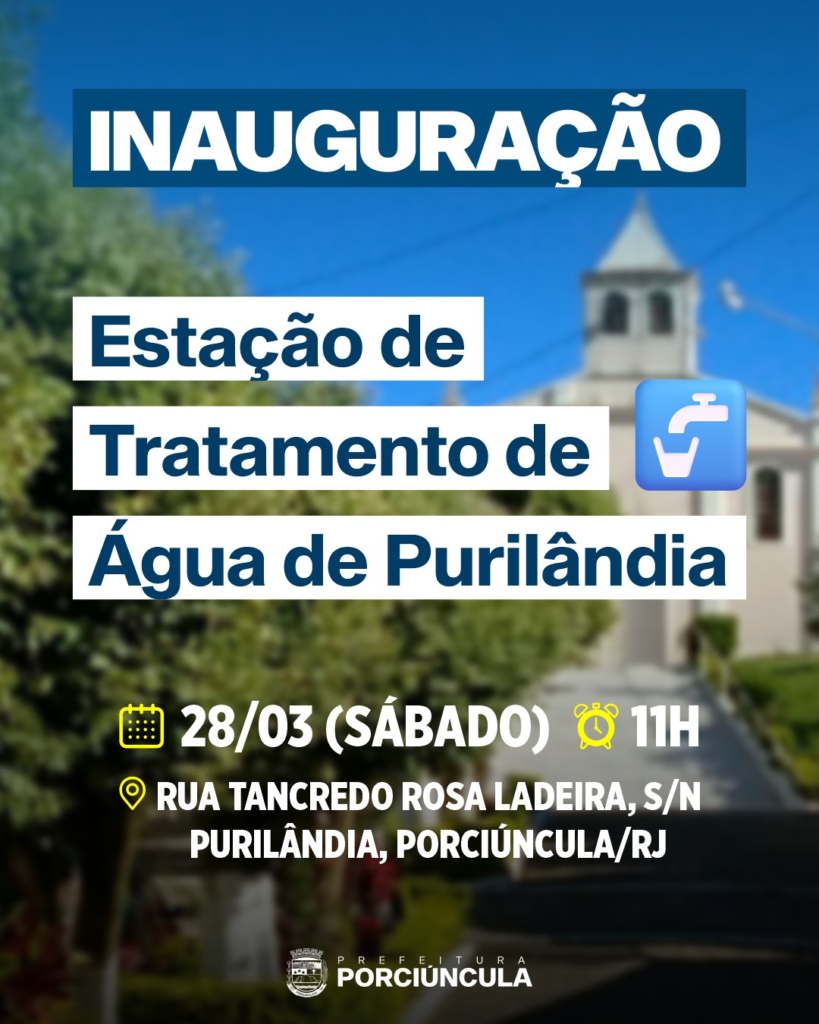 Purilândia dará um passo histórico neste sábado (28/03), às 11h, com a inauguração da primeira Estação de Tratamento de Água (ETA) móvel desenvolvida e construída pela própria CEDAE. O distrito de Porciúncula será o primeiro do estado a receber o equipamento, resultado de uma parceria entre a Prefeitura e a companhia estadual, com o objetivo de garantir água potável e de qualidade para os moradores da localidade.