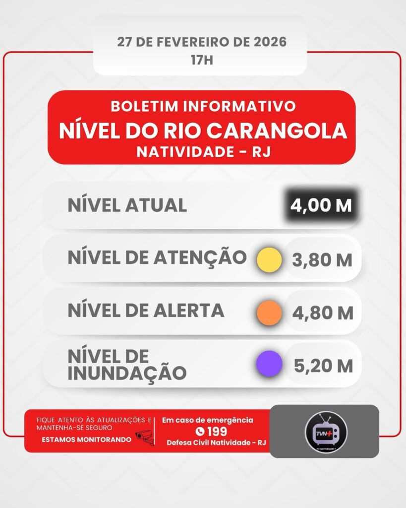 A TVN+ informa que, neste momento, o Rio Carangola, em Natividade-RJ, está medindo 4 metros.