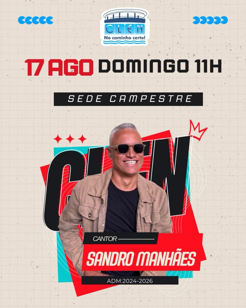 Neste domingo, 17 de agosto, a sede campestre do CLEN recebe o talento do cantor Sandro Manhães, a partir das 11h!
