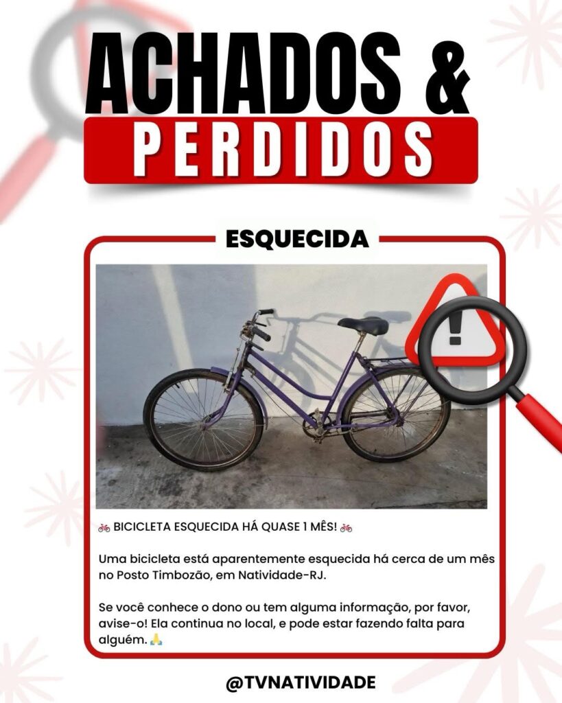Uma bicicleta está aparentemente esquecida há cerca de um mês no Posto Timbozão, em Natividade-RJ.